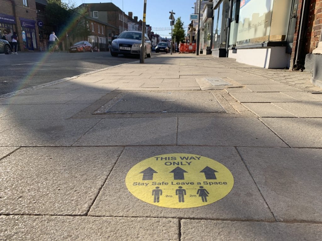 Some 250 stickers have been adhered to the pavements of the town showing pedestrians which direction they are requested to walk. Nick Wintle, Managing Director of Globe Park Print Store explains: “By reminding people to keep their distance, the graphics are playing a key role in maintaining a safe but efficient flow of shoppers throughout the town.”